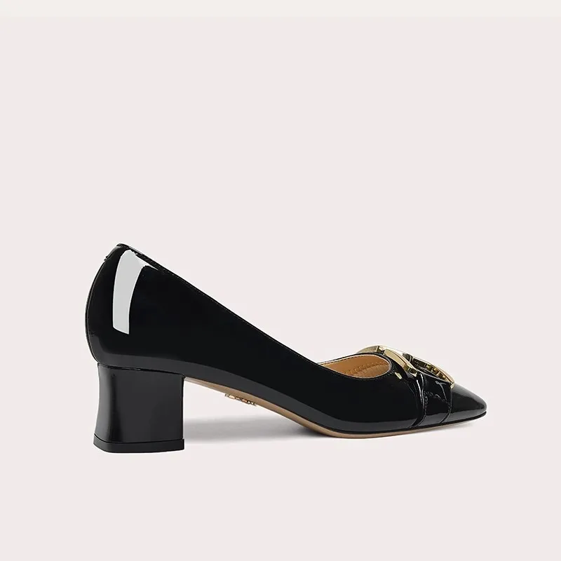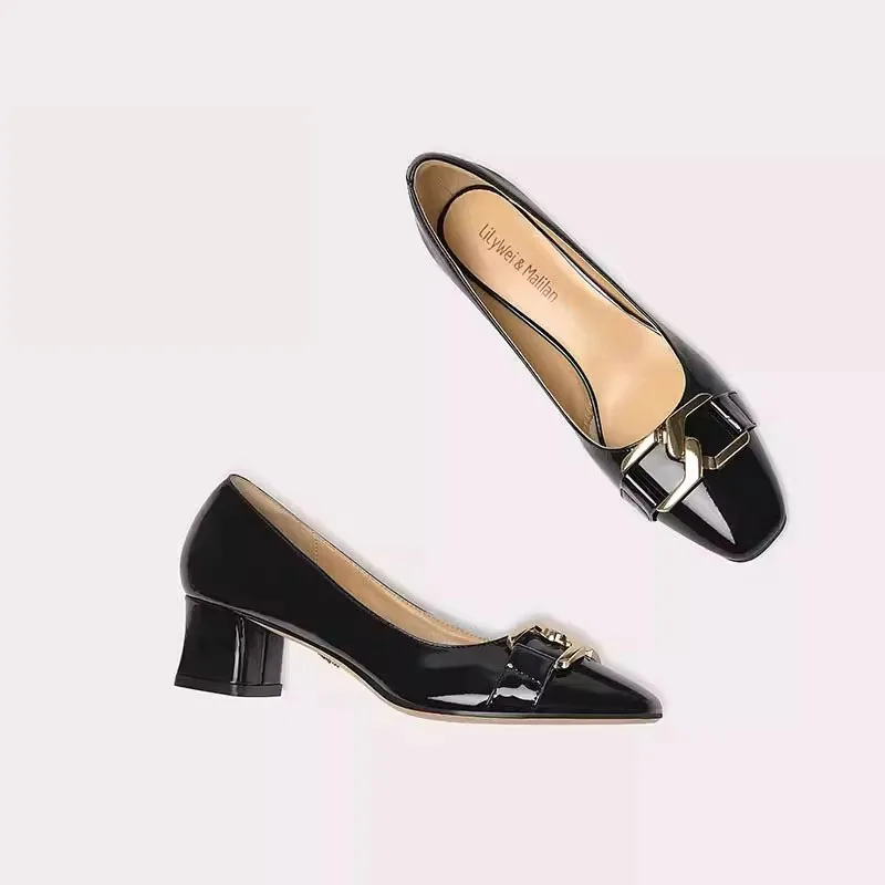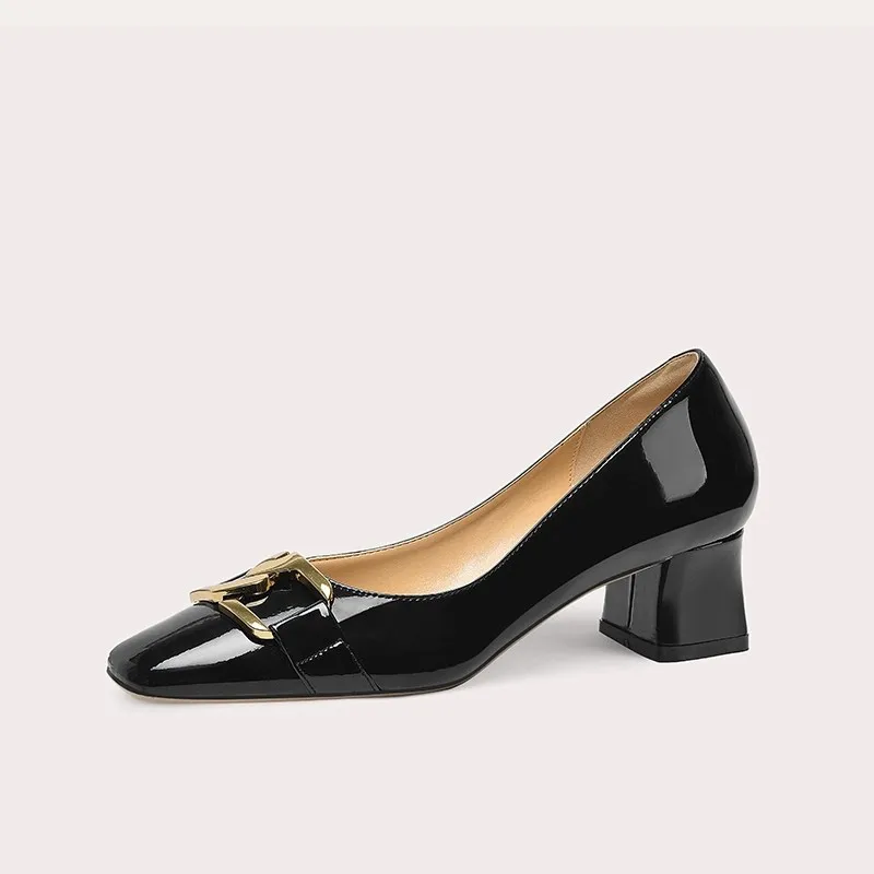 Fashion Square Heel Women Square Toe Pumps Elegant Flat Leather Dress Shoes Black Leather-soled Chunky High Heels for Ladies